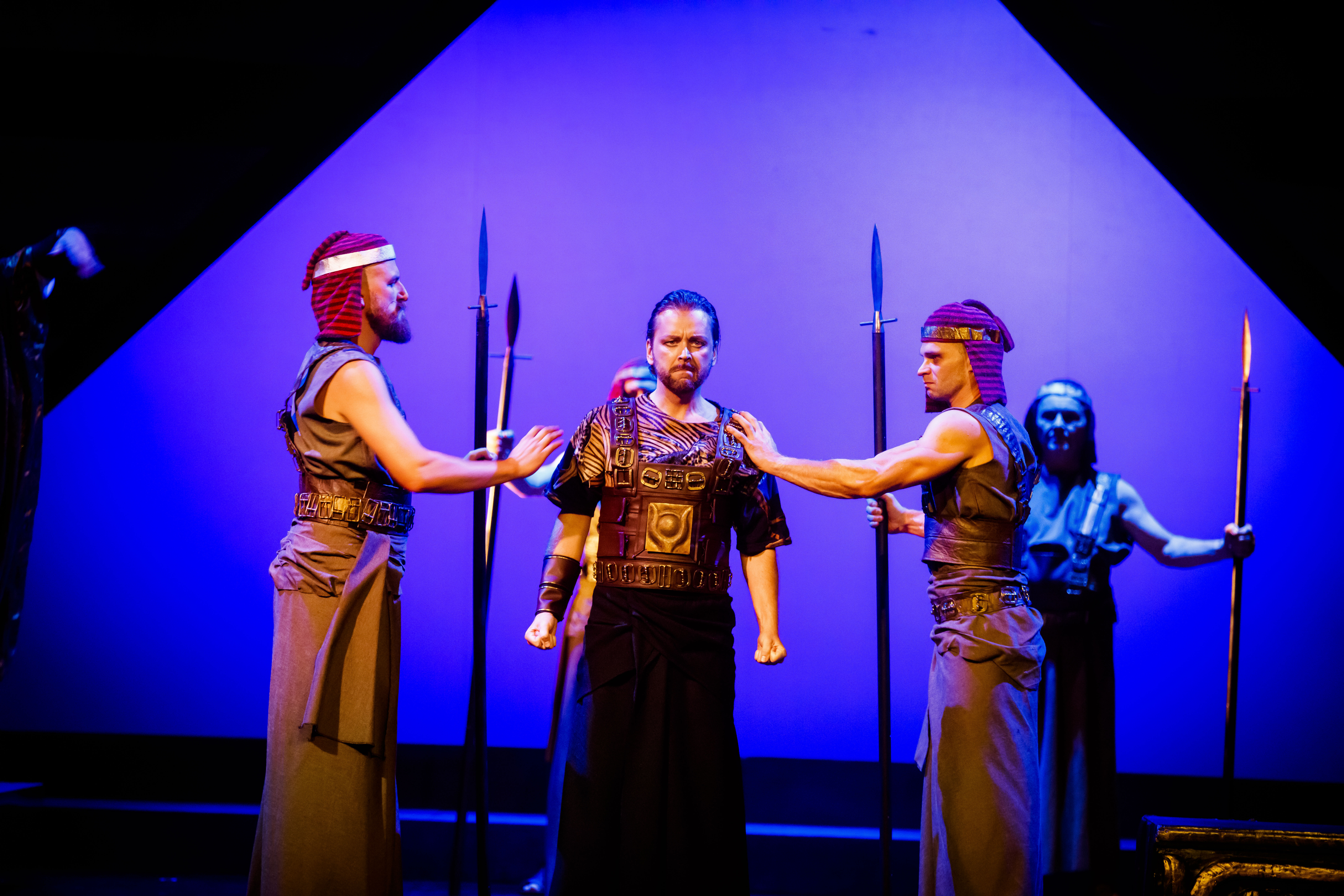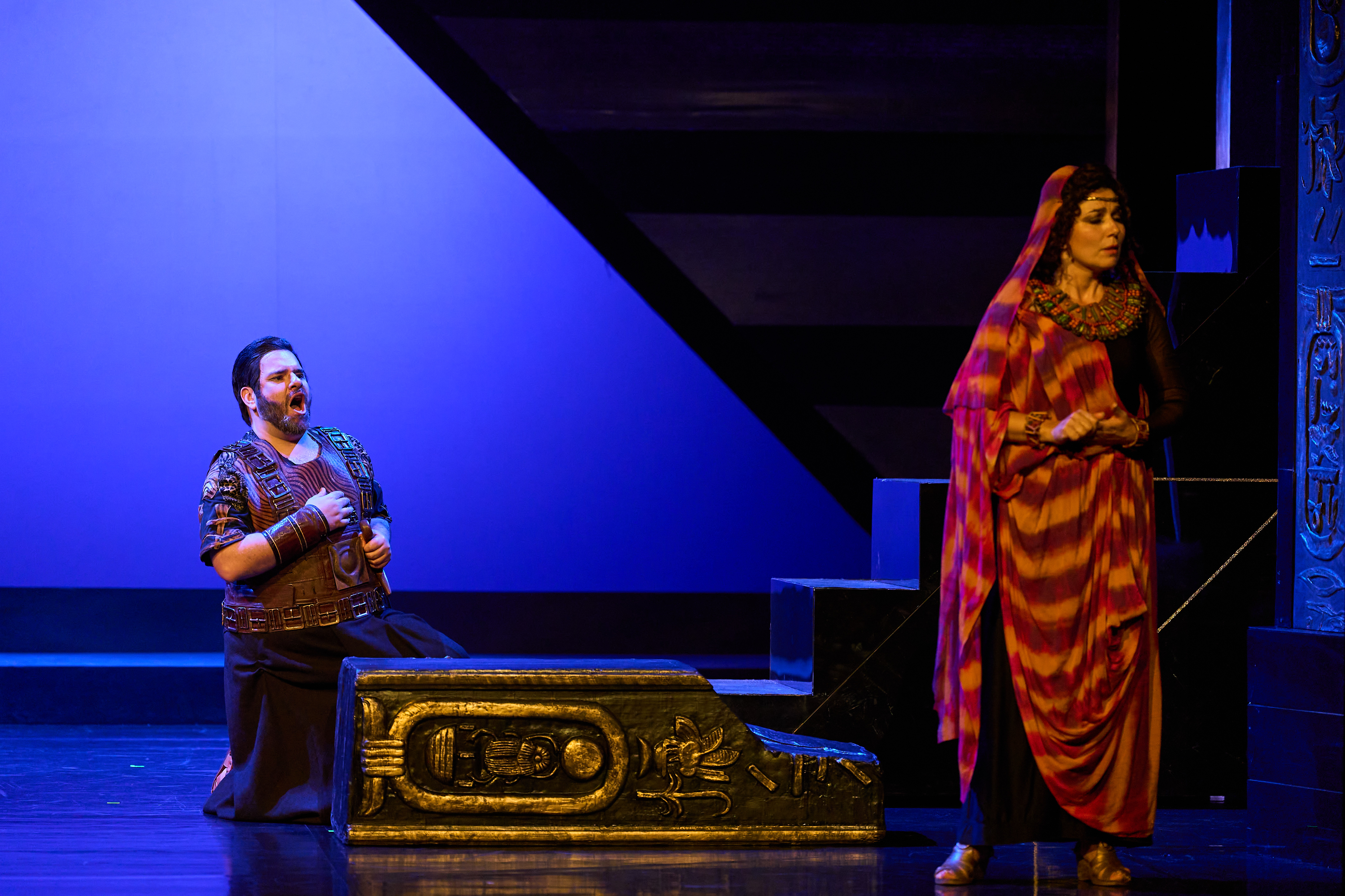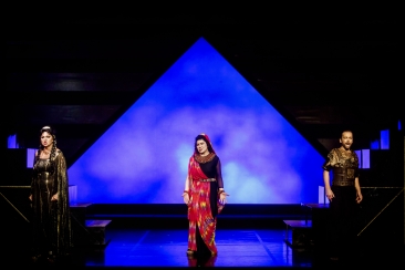 Scene 1: A hall in the King's palace; through the rear gate the pyramids and temples of Memphis are visible