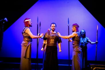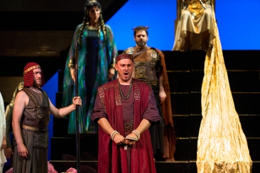 Scene 2: The lower portion of the stage shows the vault in the Temple of Vulcan; the upper portion represents the temple itself